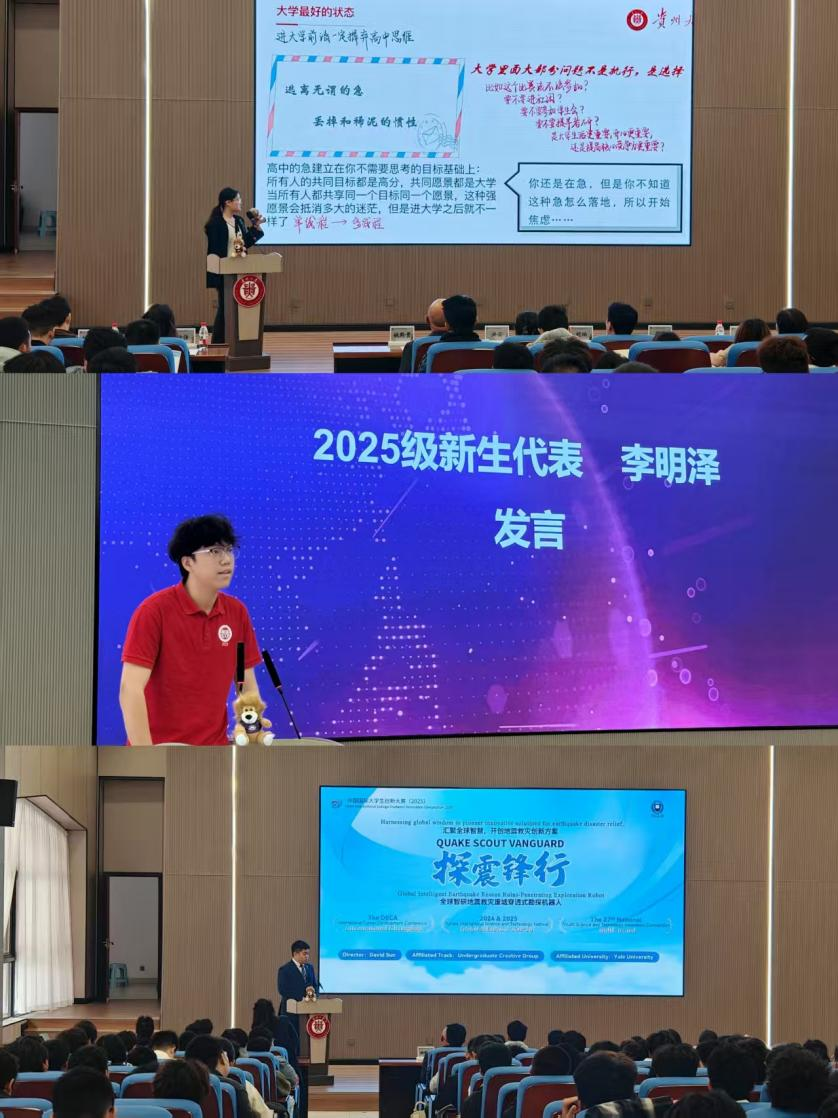 随后,2025级新生代表李明泽(环境科学2501班)发言,表达了对大学生活的期待与决心,承诺将珍惜学院资源,努力向学长学姐看齐;优秀学生代表张子轩(化学工程与工艺2201班)作分享,结合自身学习路径,分享了时间管理、课程选择与外语学习的实用建议;在中国国际大学生创新大赛(2025)国际项目参赛团队负责人杨洲同学进行了项目路演展示,分享参赛经验与创新成果。