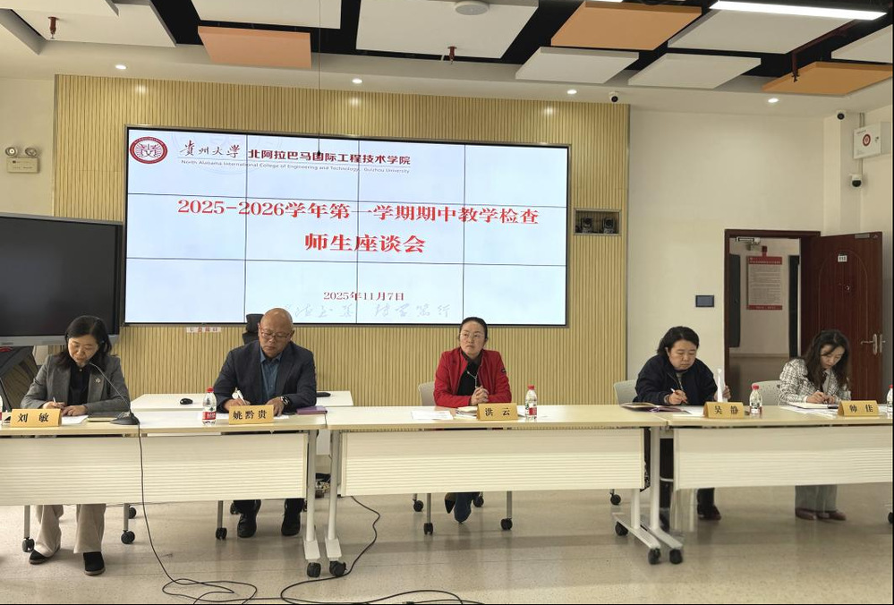 贵州大学北阿拉巴马国际工程技术学院于2025年11月7日下午13:30,在德正楼115教室召开师生座谈会。本次会议是学院教学质量保障体系的重要环节,其宗旨是搭建师生沟通的桥梁,通过双向反馈优化教学过程,推动教学相长。贵州大学党委常委、统战部部长、北阿拉巴马国际工程技术学院院长洪云,院党委书记吴静,正处级组织员姚黔贵,副院长刘敏,院党委副书记帅佳,各系主任,相关部门负责人,班主任及学生代表共同参加此次会议。会议由副院长刘敏主持。