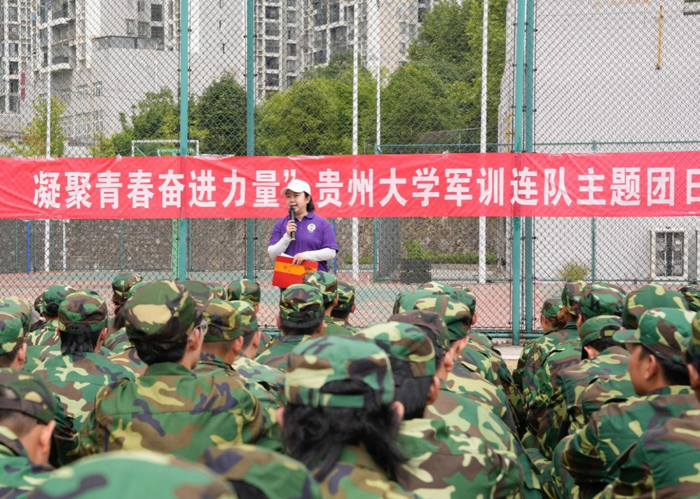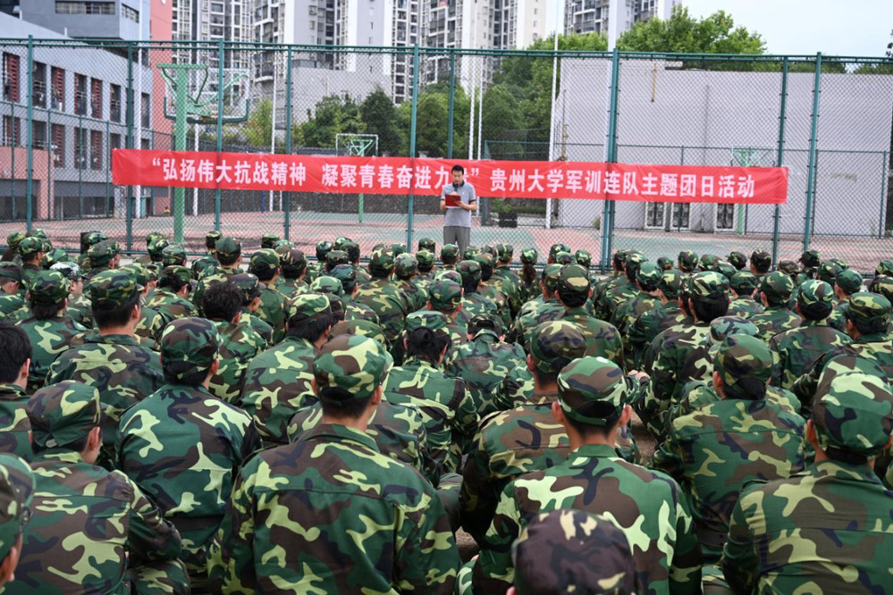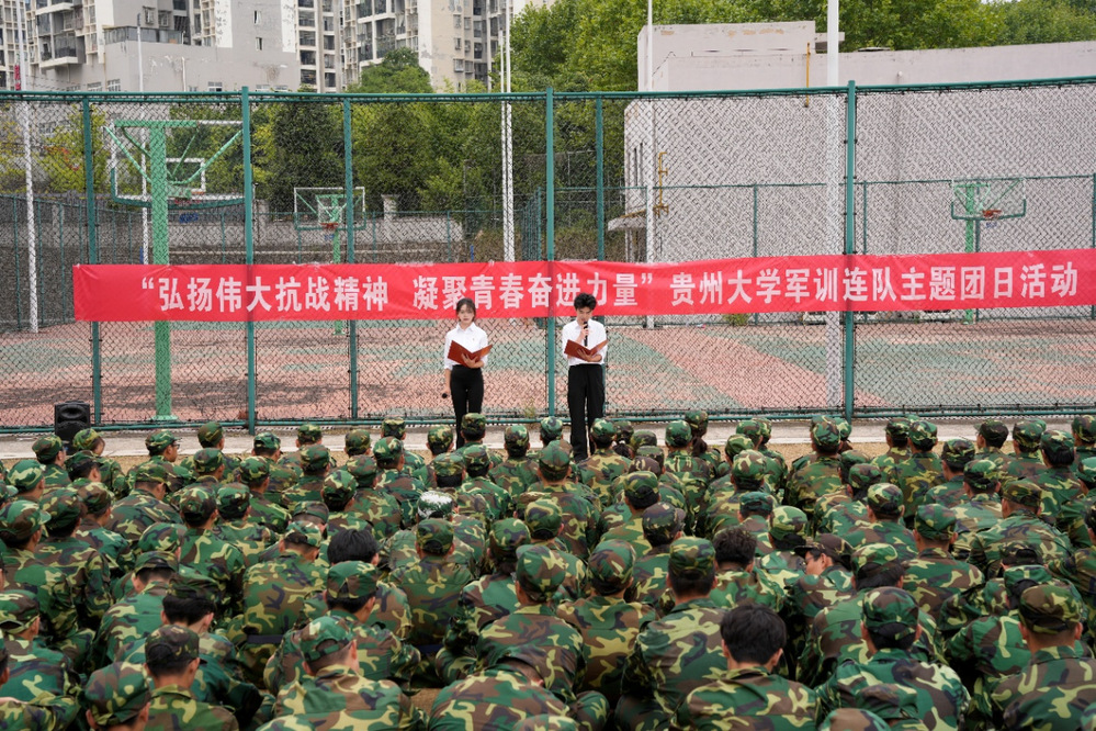 9月4日上午,“弘扬伟大抗战精神 凝聚青春奋进力量”贵州大学军训连队主题团日活动在西校区天然足球场举行。校团委书记刘魁、学院党委书记吴静、校团委副书记杨晓椿、学院党委副书记帅佳出席,校团委、学院相关负责老师及学院2025级新生六十三、六十四连全体学员参加。